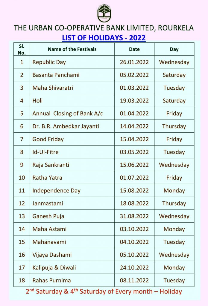 Bank Holidays โ The Urban Co operative Bank Limited , Rourkela